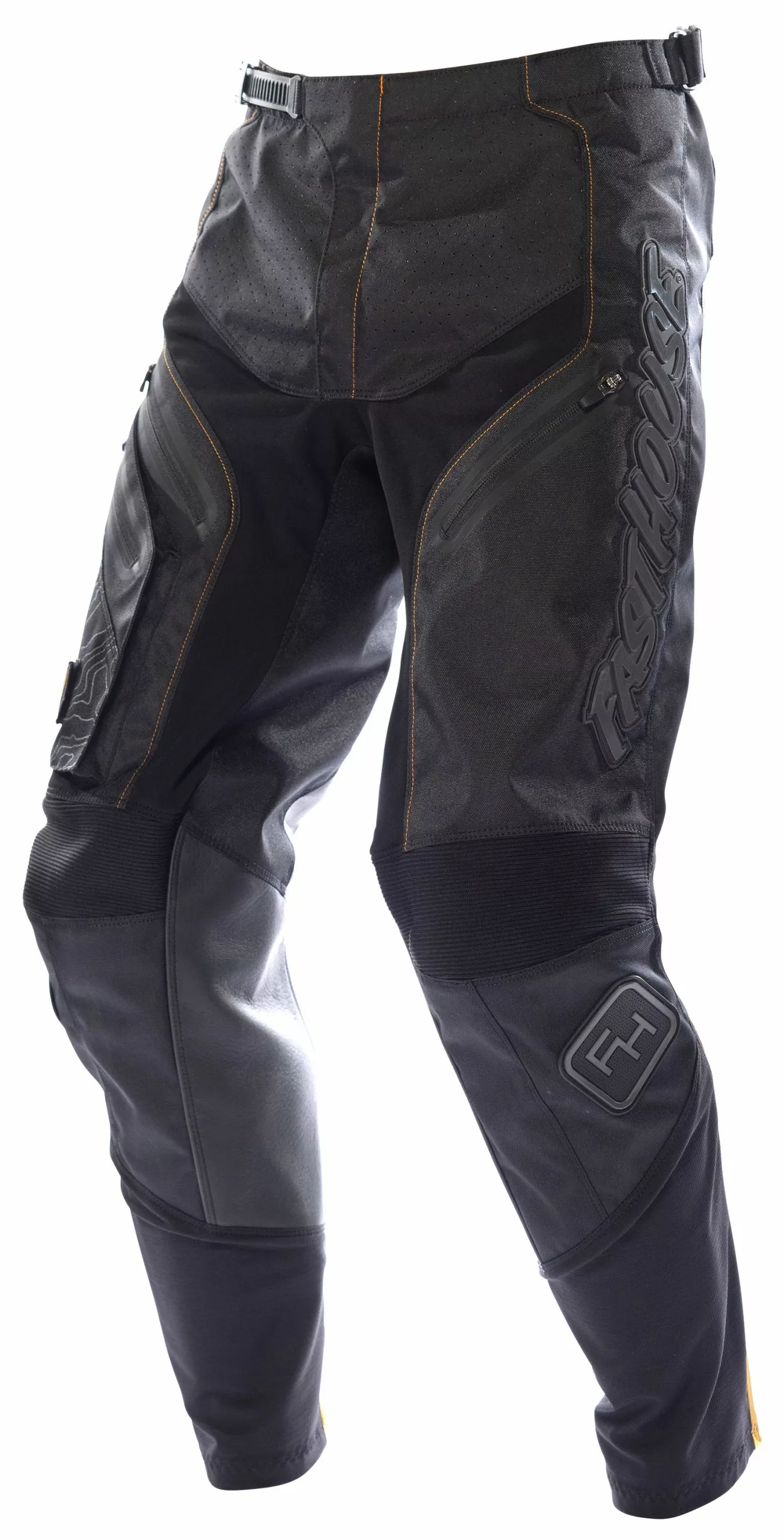 The Fasthouse Grindhouse Off-Road Pants are constructed from 600 Denier Polyester fabric to ensure a tough and durable yet comfortable fit. Lightweight and breathable panels combine with perforated front panels to provide the perfect amount of ventilation. Full grain leather knee panels and high heat resistant fabric keeps these pants perfect through every race.