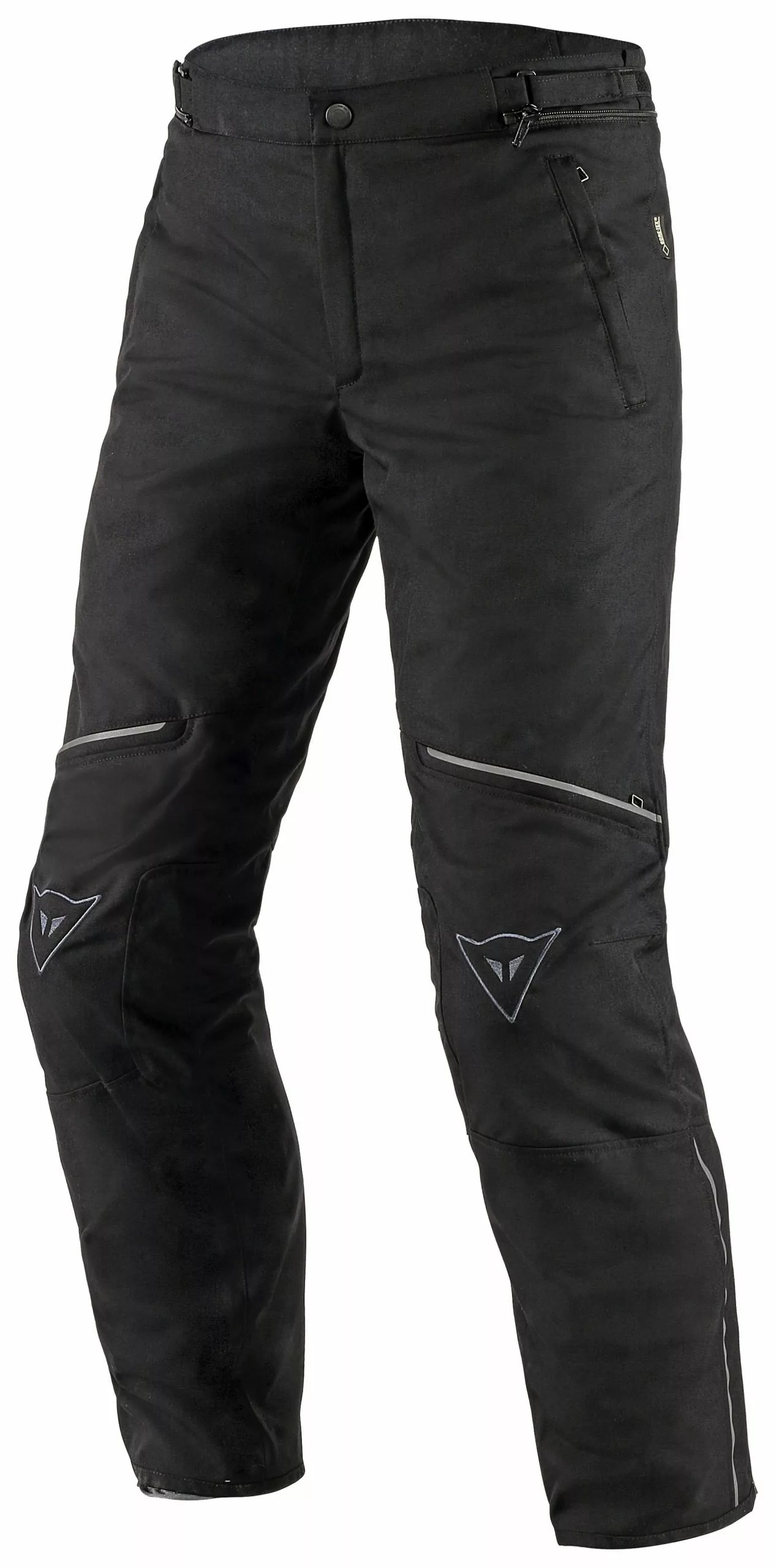 With understated styling, The Dainese Galvestone Pants incorporate more technical utility and touring functionality than they let on. The Duratex fabric chassis has inconspicuous reflective highlights in key areas, including, of course, downplayed Dainese logos at the knees concealing CE approved composite knee armor underneath. Adjustability in the waist has been purposefully designed, as are the calf zippers and the jacket-trousers fastening system. The removable thermal liner and 100% waterproof and breathable Gore-Tex membrane offer enough versatility to keep you comfortable during a commute or week long tour through varying conditions.Â