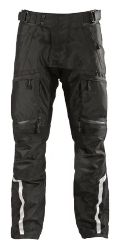 The Phantom Pants from Motonation has a shell of 600D poly and a mesh lining with 2 removal liners: the waterproof/breathable Reissa liner and a thermal liner. Horizontal open-air vents are positioned across the thighs, just above the knees with exhaust vents at the rear of each thigh. The knee and inside lower leg areas reinforced with highly abrasion resistant ballistic nylon, and the adjustable waist features adjustable hook and loop waist tabs. Zippers at the calves allow for easy entry.